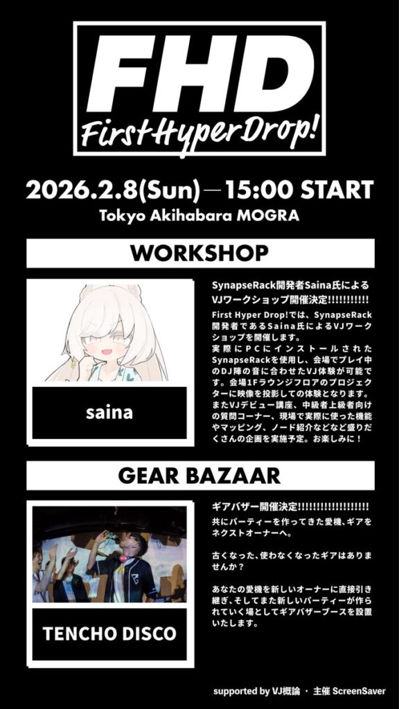 「First Hyper Drop!」は、新人VJがデビュー戦を迎えるためのイベントだ。ただし客側の利得は「新人を見守る」ことだけではない。未知の手つきが手練れの音に衝突して、偶発的に“今日だけの景色”が立ち上がる瞬間を拾える。完成品のショーケースではなく、現場で鍛造される途中の熱を見に行く、という話である。噛み合った瞬間の伸びは、録音やタイムラインではなく、その場の空気でしか成立しない。